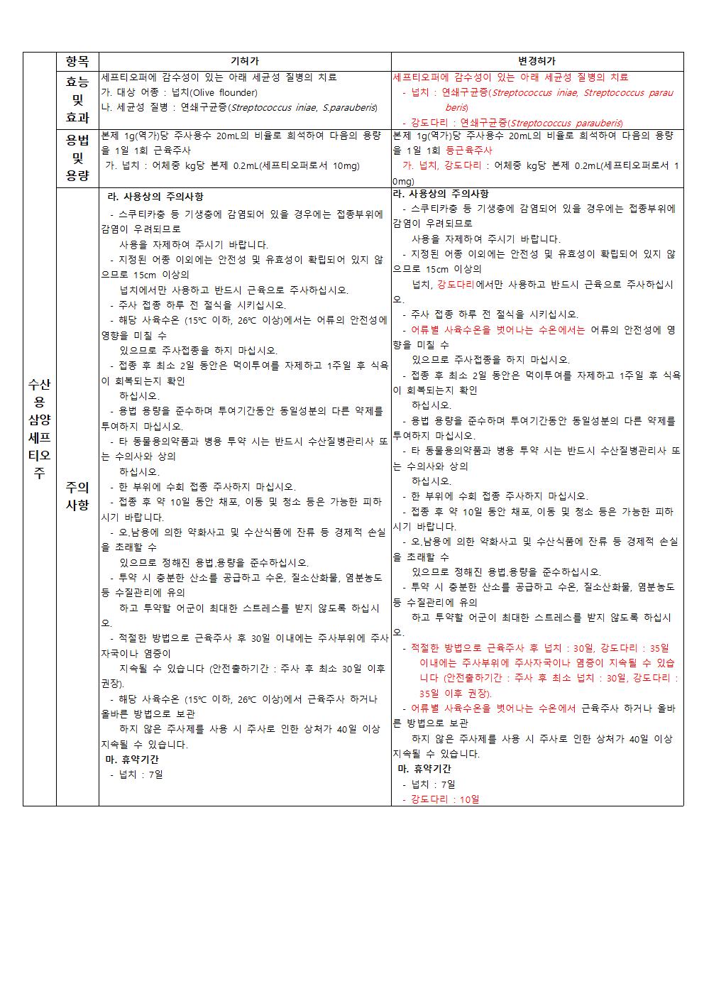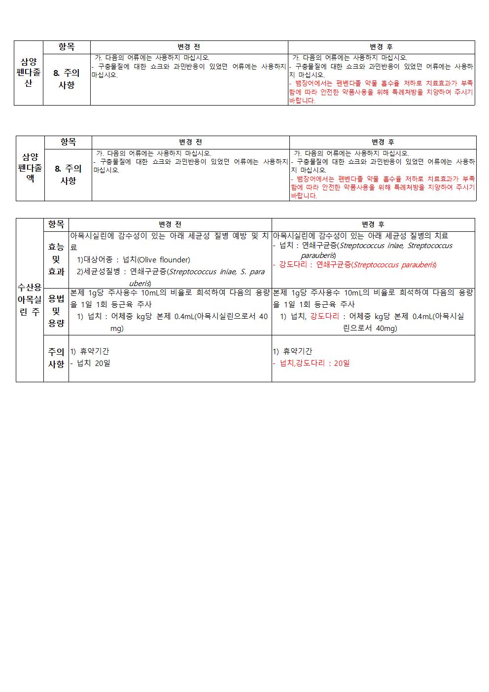 국립수산물품질관리원에서 실시하는 PLS(잔류허용물질 목록관리제도) 시행에 따라 다음 제품에 대한 허가사항(효능 및 효과, 용법 및 용량, 주의사항)이 변경되었음을 알려드립니다. 변경일 이전 출고된 제품을 보유하신 판매처(동물용의약품도매상, 동물병원, 동물약국) 및 사용자분들께서는 변경사항을 반드시 확인하여 주시기 바랍니다.